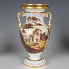 A Ridgway porcelain two-handled vase, circa 1820, the tapered body painted with a continuous landscape view with a stately home to one side and church ruins to the other, flanked by gilt scroll handles with animal head terminals, pattern No. 3/635, height 19.5cm, together with three other English porcelain vases, probably Ridgway, height of tallest 22cm.