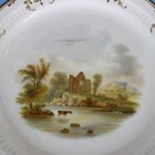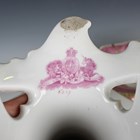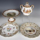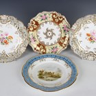 A Ridgway porcelain centrepiece, mid-19th century, the white glazed body decorated to the interior with flowers beneath the pierced gilt edged rim with foliate moulded handles, puce printed Royal arms mark to base with pattern No. 6409, diameter 33.5cm, together with an H. & R. Daniel shell pink ground centrepiece, circa 1825, first gadroon shape, painted with panels of fruit and flowers within gilt framing, painted pattern No. 3813, length 34cm (haircrack), and a small group of other English porcelain, including a Minton comport.