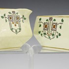 A rare T.G. Green Church Gresley oblique shape Chatsworth pattern milk jug and sugar bowl, circa 1930, decorated with Mackintosh style motifs, printed marks to bases, height of jug 6.2cm.
