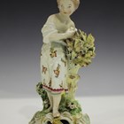 A set of four Derby porcelain French Season figures, late 18th century, modelled after Pierre Stephan as children emblematic of Spring, Summer, Autumn and Winter, raised on pierced scroll moulded bases picked out in turquoise enamel and gilding, height 22cm (minor faults).