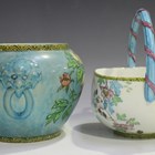 A Théodore Deck pottery basket, circa 1870, of rounded rectangular shape, decorated in Japanese style with birds and butterflies amidst flowers and blossom beneath an overhead turquoise and pink glazed handle, red printed mark to base, length 18.5cm, together with a Théodore Deck Japonaiserie turquoise ground jardinière with moulded Buddhistic lion head handles, height 12.8cm (drilled to base).