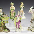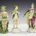 A Continental porcelain Meissen style figure of a gardener, late 19th century, modelled as a seated gentleman with a basket of flowers on his lap, on a naturalistic base, blue crossed swords mark to base, height 20cm, together with a Paris porcelain figure of Justice, height 17cm, a figure of a boy beating a dog, a Staffordshire porcelain boy holding a bird's nest, and a figure of a putto (faults and restoration).