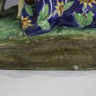 A French faience figure of the Madonna and Child, late 19th century, probably Moustiers, modelled standing in a blue cloak painted with sunflowers, the child in her arms and a lamb at her feet, on a base titled 'MADONNA DELL' AGNELLO', indistinct monogram mark to side edge of base, height 51cm (minor faults).