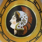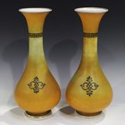 A pair of orange ground opaline glass vases, circa 1860, the pear shaped bodies with flared trumpet necks, both decorated with a circular panel of a classical portrait bust within a gilt and black chain border, height 34.5cm (typical wear).