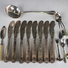 A set of eight Victorian silver Old English, Thread and Shell pattern fish knives, each shaped blade with engraved decoration, London 1854 by Smith, Nicholson & Co, together with a silver soup ladle, Sheffield 1927, a small group of silver spoons and a silver butter knife with ivory handle, total weight 925g including all handles.