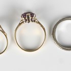 A 9ct gold, sapphire and diamond oval cluster ring, ring size approx L, a 9ct gold and diamond single stone ring, weight 3.2g, a gold ring, claw set with a rectangular step cut amethyst, detailed '585', weight 3.8g, a gold and silver set colourless gem eternity ring, detailed '9ct & Sil', weight 2.8g, and a silver ring.