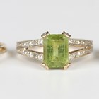 A 9ct gold ring, claw set with a cut cornered rectangular step cut peridot between diamond set shoulders, ring size approx K1/2, a 9ct gold, synthetic blue and colourless gem set square cluster ring and a 9ct gold ring, mounted with a cultured pearl, total weight 6.4g.