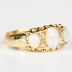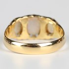 An 18ct gold, opal and rose cut diamond ring, mounted with three oval opals alternating with two pairs of variously cut diamonds, Birmingham 1911, weight 3.2g, ring size approx O, with a case.