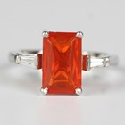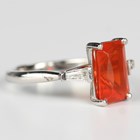 A platinum, fire opal and diamond three stone ring, claw set with the rectangular cut fire opal between tapered baguette diamond single stone set shoulders, unmarked, weight 5.9g, ring size approx M, with a case.