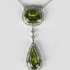 A white gold, peridot and diamond pendant necklace, the front collet set with an oval cushion cut peridot within a surround of circular cut diamonds above a pear shaped peridot and diamond set drop, detailed '18K', on a white gold circular link neckchain with a boltring clasp, detailed '750', weight 6.3g, length 45.5cm, with a case.