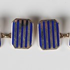 A pair of gold and blue enamelled cut cornered rectangular cufflinks, decorated with blue enamelled stripes, detailed '9ct', weight 6.9g, dimensions of each front 1.5cm x 1.1cm, with a case.
