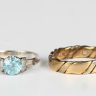 A white gold, platinum, blue zircon and colourless gem set ring, weight 2.2g, ring size approx O, a 9ct gold and colourless gem set ring, a 9ct two colour gold wedding ring, weight 5.3g, and a gold synthetic red and colourless gem set ring, unmarked, weight 3g.