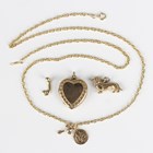 A small group of 9ct gold jewellery, comprising an oval link neckchain, length 47cm, a charm designed as a dog, an initial 'J' charm, a pendant cross and a St Christopher pendant, total weight 5g, together with a gold back and front heart shaped pendant locket, detailed '9ct', weight including interior 3.3g.