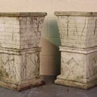 A pair of 20th century white painted cast composition stone garden urns, the moulded brick-effect urns on square section pedestals, height 76cm, width 41cm.