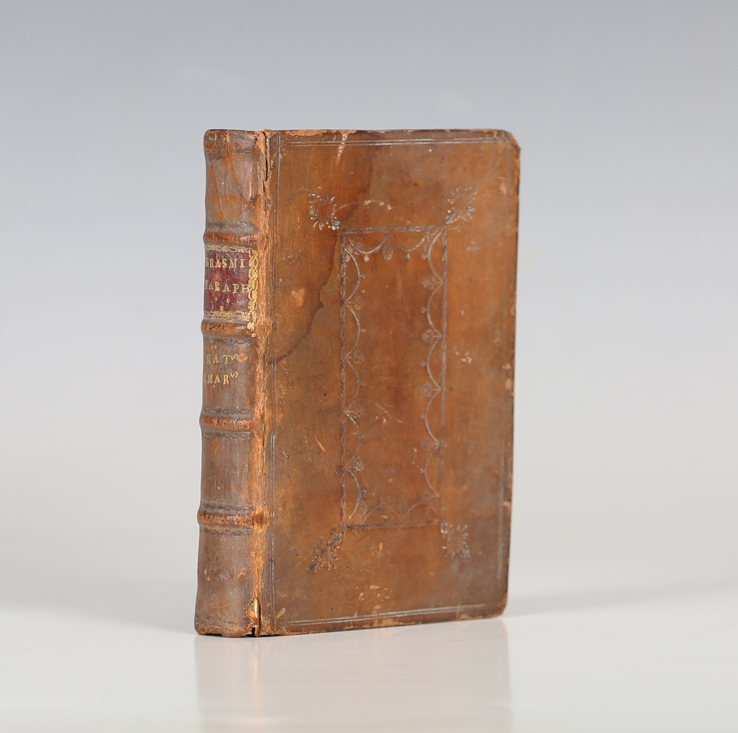 ERASMUS. Tomus Primus Paraphraseon… in Novum Testamentum, videlicet in quatuor Euangelia & acta apostolorum. Paris: Perri Regnault, 1540. 2 parts in 1 vol., 8vo (134 x 87mm.) 2 parts with separate titles, Regnault elephant woodcut printer's device to both titles, 22 woodcut illustrations in the text. (Toning, front and rear blanks replaced, damp-staining from title to f1.) 18th century tooled calf, red morocco lettering piece to the spine (damp-stain to covers, endpapers replaced). Note: Erasmus wrote his paraphrase of the New Testament between 1517 and 1524 (with the exception of 'Revelations'). It was received to great acclaim and an English translation was made in 1548 and ordered to be placed in all parish churches, next to the Bible.