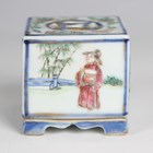 A Chinese famille rose porcelain incense burner and cover, early 20th century/Republic period, of cube form, the top with pierced cash motif, painted with panels of figures and flowers within underglaze blue borders, height 4.2cm.