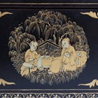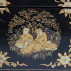 A Chinese Canton export lacquer rectangular box with domed hinged lid, mid to late 19th century, finely decorated in gilt with figural and dragon roundels within gilt foliate borders, on a dark brown/black ground, the interior with removable tray, length 26.8cm.