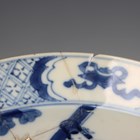 A Chinese blue and white porcelain circular bowl with flared rim, mark of Chenghua but Kangxi period, the exterior painted with maidens in a continuous garden scene, beneath a rim of trellis and precious object vignettes, the interior with dancing boys roundel, underglaze blue six-character mark to base, height 9.1cm, diameter 20.5cm (repaired).