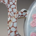 A Chinese pink enamelled relief moulded lavender glazed porcelain teapot and cover, 20th century, the flattened circular body decorated in relief to both sides with dragon, vapours and ruyi head border, the cover with lotus finial, underglaze blue leaf mark to base, height 21.5cm (repaired spout and handle and chips to finial).