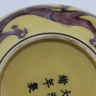 A pair of Chinese famille verte yellow ground enamelled biscuit porcelain saucer dishes, mark of Guangxu and probably of the period, each painted in green and aubergine with a pair of confronted dragons within black line borders and a rim of scattered blossoming branches, the underside with another pair of dragons divided by lingzhi fungus, black enamelled six-character mark to bases, diameter 11cm.