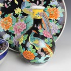 A group of Japanese porcelain, 20th century, painted in the Chinese style with birds and flowers, comprising a pair of black ground bottle vases, height 23cm, a black ground bowl, diameter 24cm, and two circular dishes, diameters 36.7cm and 40.5cm.