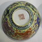A pair of Chinese eggshell porcelain bowls, mark of Qianlong but mid-20th century, each of hemispherical form, enamelled inside and out with polychrome dragons and vapours on yellow and turquoise grounds, iron red enamelled seal marks to bases, diameter 13.8cm, height 6.6cm (one with minor restoration to footrim).