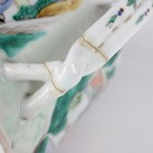 A Chinese famille verte porcelain cylindrical teapot and cover, mid to late 19th century, the body painted with figural scenes, height 13cm (repaired handle).