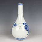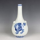 A Chinese blue and white porcelain bottle vase, mark of Kangxi but probably 20th century or later, the pear shaped body painted with two opposing Buddhistic lions between moulded elephant mask and ring handles, the rim and foot with keyfret bands, underglaze blue six-character mark to base within double ring, height 37.5cm.