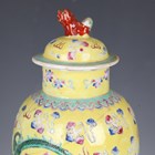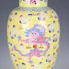A collection of Chinese porcelain, 19th century and later, including a pair of Canton famille rose diminutive vases, height 9.2cm, three Canton famille rose enamelled celadon ground circular dishes, diameters 24.2cm, 19cm and 14.4cm, various blue and white dishes and a famille rose enamelled yellow ground vase and cover, painted with dragons and vapours, height 31.5cm (some faults).
