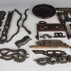 A collection of Chinese wood stands, 19th century and later, including a circular hardwood stand with carved and pierced freeze, diameter 17cm, a larger circular stand with carved and pierced frieze, diameter 21cm, a hardwood table screen stand, height 18.3cm, various other stands and assorted hardwood stand parts and friezes (faults).