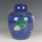 A Chinese famille verte powder blue ground porcelain ginger jar and cover, 20th century or later, the ovoid body painted with four fish, the domed cover with a single fish, underglaze blue double ring to base, height 26cm.