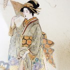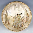 A Japanese Satsuma earthenware circular bowl with scalloped rim by Kinkozan, Meiji period, the interior painted and gilt with a group of bijin and children beneath wisteria, the exterior with continuous coastal landscape, iron red and gilt signature to base, diameter 18.6cm, height 7.2cm (small hairline to rim).