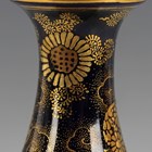 A Japanese Satsuma earthenware bottle vase by Kinkozan, Meiji period, the low-bellied pear form body painted and gilt with opposing oval figural panels, reserved against a blue ground filled with gilt flowers, mon and speckled decoration, indistinct iron red signature to base, height 17.5cm.