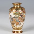 A Japanese Satsuma earthenware vase by Hasegawa, Meiji period, of baluster form, painted and gilt with opposing panels of figures and landscape, reserved against a floral and simulated brocade ground, iron red and gilt signature to base, height 9.7cm (chip to footrim), together with a Satsuma earthenware kettle by Hattori, Meiji period, painted and gilt with birds and wisteria, black painted signature to base, height 3.9cm (minor faults and restoration).