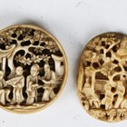 A small group of South-east Asian works of art, 19th and 20th century, including two Canton export ivory panels, carved with figures in village scenes, diameter 4cm and length 4cm, a Chinese carved coquilla nut necklace, a Japanese ivory okimono, Meiji/Taisho period, modelled as a seated fisherman, height 7.8cm (faults), and a soapstone carving of monkeys.