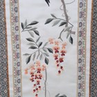 A pair of Chinese silk embroidered sleeve style panels, 20th century, worked in coloured threads with birds amidst blossom, flowers and foliage, within applied geometric borders, 55cm x 21cm, framed and glazed, together with a similarly decorated square panel, 33cm x 33cm, framed and glazed.