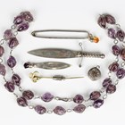 A Victorian silver bookmark, designed as a dagger, Birmingham 1887, length 9.5cm, a silver bookmark with a mauve paste finial, Birmingham 1924, weight 8.6g, a kilt pin, an amethyst bead necklace, a Victorian gilt metal stickpin with a serpent finial and a pendant.