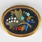 A Florentine gold mounted oval pietre dure brooch, last quarter of the 19th century, designed as a floral spray, including lily-of-the-valley and forget-me-nots, within an openwork and beaded border, inscription to the back of the brooch, unmarked, weight 24g, width 6cm.