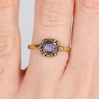 A Victorian gold and pale amethyst single stone ring, mounted with a cushion cut pale amethyst within a decorated surround, weight 1.6g, ring size approx L.
