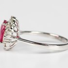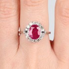 A white gold, treated ruby and diamond cluster ring, claw set with the oval cut treated ruby within a surround of circular, baguette and tapered baguette cut diamonds, detailed '750', weight 3.8g, total diamond weight approx 0.57ct, ruby weight approx 1.62ct, ring size approx N, with a Gemological Report from the World Gemological Institute.