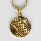 A gold circular pendant with a coffee pot motif, the suspension ring detailed '916', weight 4.7g, length 2.8cm, with a gold multiple flat link neckchain, detailed '750', on a sprung hook shaped clasp, weight 7.8g, length 44.5cm.