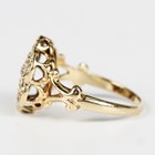 A gold and diamond cluster ring in a flowerhead shaped design, mounted with circular cut diamonds between split scrolled shoulders, detailed '15ct', weight 2.7g, ring size approx K, with a case.