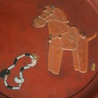 An early 20th century Japanese red lacquer circular wine table, the top decorated with a horse and bearing signature, raised on a turned stem and quatreform base, height 67cm, diameter 32.5cm.