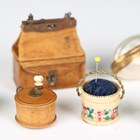 A small group of mainly 19th century needlework items, including a mother-of-pearl cased nécessaire, length 5cm, a leather cased nécessaire in the form of a bag (faults), three tape measures and a pin cushion of basket form.