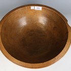 A 19th century turned sycamore dairy bowl, diameter 35cm, a smaller similar food bowl, a large sycamore butter stamp, height 13.5cm, a small painted wooden box with swing-over handle, width 9.5cm, and a treen whistle.