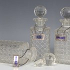 An Edwardian oak and plate mounted three-bottle tantalus, fitted with three glass decanters and stoppers, each with a silver label, 'Whisky', 'Brandy' and 'Gin', width 39cm.
