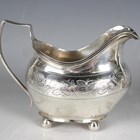 A George III silver milk jug of cushion form, engraved with a band of leaves, raised on ball feet, London 1815 by Thomas Richards, height 9.5cm, and a similarly decorated silver milk jug of oval form, marks worn, height 10cm, total weight 234g.