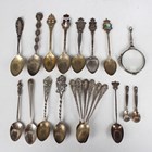 A set of six sterling silver coffee spoons with foliate decoration, a small collection of sterling silver collectors' spoons and a pair of Georg Jensen sterling acorn pattern salt spoons, total weight 166g, together with a pair of sterling mounted folding lorgnettes.