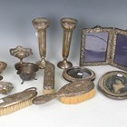 A group of silver items, including a pair of specimen vases, three photograph frames and three bonbon dishes, together with a group of plated items, including knife rests and a crumb scoop.