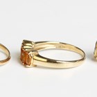 A 9ct gold and pale orange sapphire five stone ring, mounted with a row of five oval cut pale orange sapphires, ring size approx N, a 9ct gold ring, claw set with an oval cut amethyst, a 9ct gold and colourless gem set half hoop ring, another 9ct gold ring, mounted with an oval cut blue topaz, and a gold, seed pearl and peridot ring, detailed '9ct'.